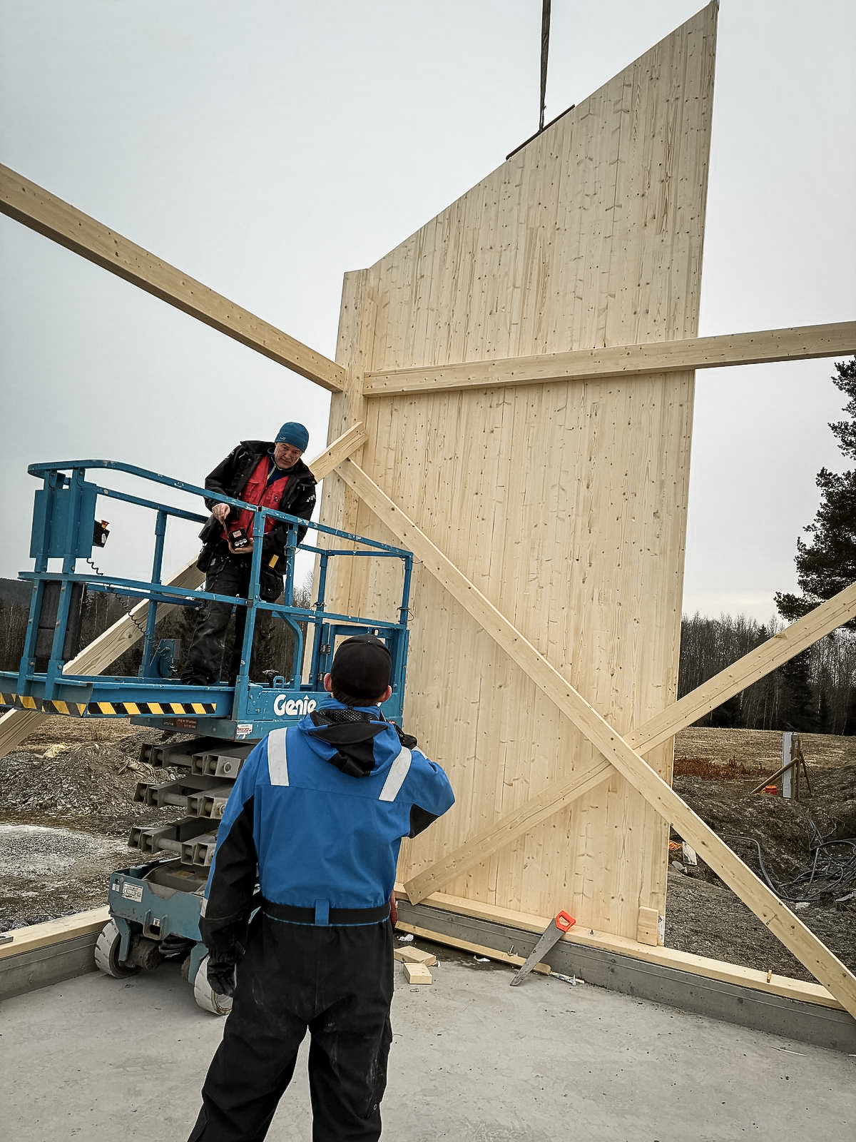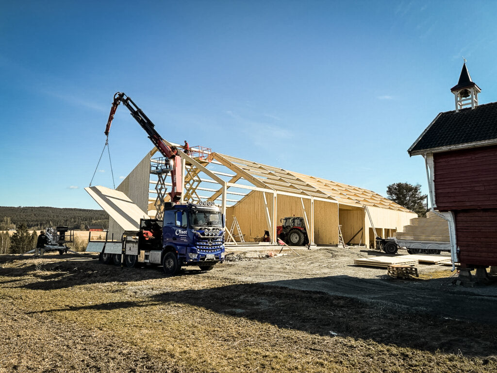 Fra monteringen av låve i massivtre på Salerud gård. Foto: XL3 Bygg.
